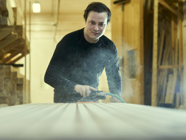 – Vi hogger trær i Ness i Verdal, transporterer trærne til Mære for å sage og tørke dem, før de blir sendt til limtrefabrikken i Mosvik. Deretter kommer de tilbake til oss. Her ferdigstiller vi skreddersydde produkter, før de blir levert til kundene, forteller Eirik Brun-Svendsen, som til daglig jobber i Arkitre og eier halvparten av aksjene i selskapet, mens Atle Aune i Snekkeriet eier den andre halvparten.
